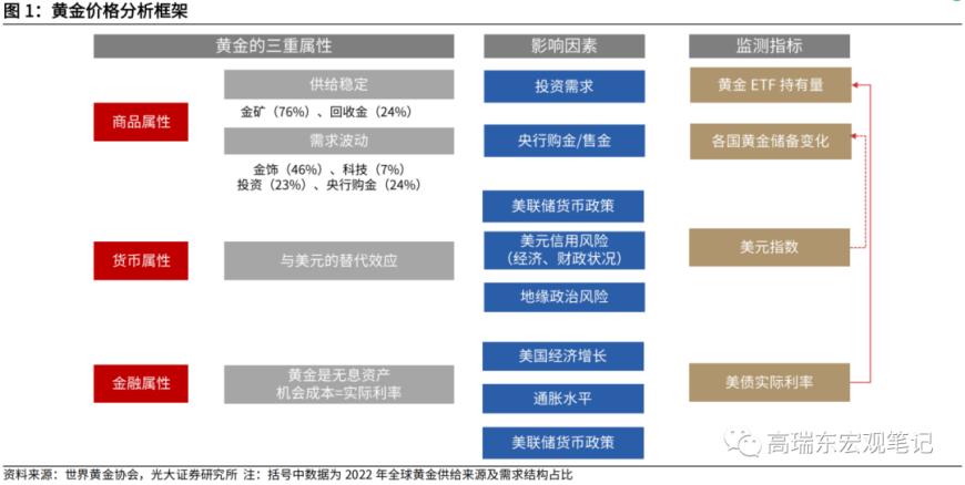 黄金包含商品、货币、金融三重属性,其价格变动主要来自于美债实际利率驱动的投资需求,以及避险需求、去美元化带来的央行购金需求。