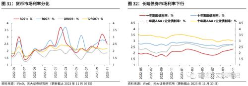 货币市场利率表现分化,长端债券市场利率下行。2023年11月,R001较上月末下行71bp至2.50%;R007较上月末下行14bp至2.65%;DR001较上月末上行1bp至1.87%;DR007较上月末上行3bp至2.18%。