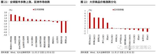 全球股市多数上涨,亚洲市场收跌。本周(11月26日至12月01日),美股全线上涨,道琼斯工业指数、标普500、纳斯达克指数分别上涨2.42%、0.77%、0.38%;欧洲股市全线上涨,法国CAC40、德国DAX分别上涨0.73%、2.22%,英国富时100、意大利富时MIB分别上涨0.55%、1.69%;亚洲股市多数下跌,韩国综合指数上涨0.34%,恒生指数、日经225、上证指数分别下跌4.15%、0.58%、0.31%。