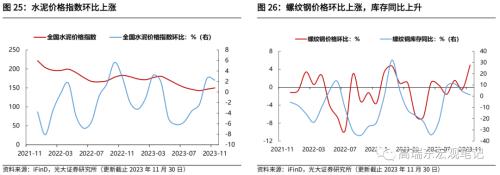 螺纹钢价格环比上涨,库存同比上升。2023年11月,螺纹钢价格环比上涨4.94%,上月为环比下跌0.43%。螺纹钢库存同比增幅放缓,由上月的4.42%下降为本月的1.14%。
