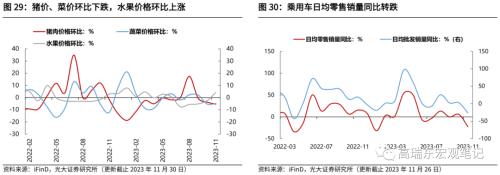 猪价、菜价环比下跌,水果价格环比上涨。2023年11月,猪肉价格环比下跌5.39%至20.35元/公斤,跌幅相对上月扩大1.69个百分点;蔬菜价格环比下跌4.89%至4.6元/公斤,跌幅相对上月扩大0.37个百分点;水果价格环比上涨4.27%至6.84元/公斤,环比由负转正。