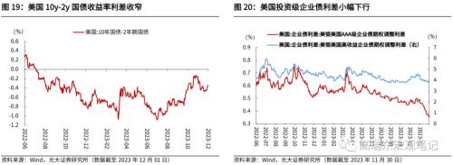 美国10y-2y国债收益率利差小幅收窄。本周美国10年期和2年期国债期限利差为-0.34%,较上周回升11BP。美国AAA级企业期权调整利差较上周下行2BP,为0.35%;美国高收益债期权调整利差较上周末下行1BP至3.84%(截至11月30日)。