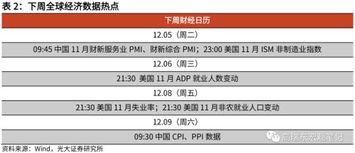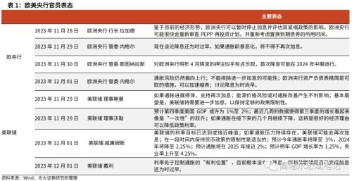 最近一周,市场对明年3月降息的预期大幅升温,而鲍威尔仍坚持偏鹰态度,表示未来货币政策决策仍然取决于经济数据和风险考量。截至12月2日,市场预计明年3月降息概率已经升至55.1%,远高于11月27日预期的21%,同时也高于5月降息概率41.5%。但12月1日鲍威尔仍表示,“在必要时进一步收紧货币政策。目前得出美联储已实现足够紧缩的货币政策立场的结论还为时过早,也不应推测何时开始降息。”但其对于再度加息的态度已经十分谨慎,表示货币政策“进入了紧缩领域”,但加息的全部效应可能还未完全显现,将根据“所有即将到来的数据的总体情况”和风险平衡逐次会议做出决策。
