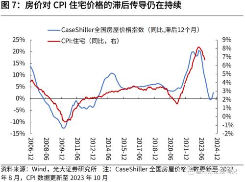 一是,住房通胀降温幅度和持续性仍有待观察。二季度以来,受前期房价下跌的滞后效应影响,住房租金价格处在趋势性回落阶段。10月住房环比、同比分别降至0.3%、6.7%,仍处在偏高水平。按领先一年的规律,预计前期房价下跌对住房通胀的影响会持续至明年年中。但考虑到2023年上半年美国房屋价格持续上涨,从其领先性来看,或抑制明年下半年住房通胀的降温效果。