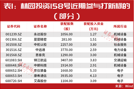 与此同时,林园也在积极入市。继此前发布跟投公司旗下所有产品新增净申购额20%之后,林园投资于11月29日再度公告表示,跟投份额永不赎回。另外,林园也在持续关注打新这一“弯腰捡钱”的机会。据Wind数据不完全统计显示,11月份,林园投资以及汉中林园投资旗下100余只基金现身参与打新,累计获配投入资金超过2000万元。以林园投资158号私募证券投资基金为例,其11月参与打新并获配了包括永达股份、夏厦精密等在内的10只个股(见表1)。