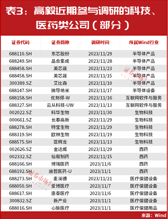 整体来看,私募机构近期调研标的涉及多个领域,对以下领域相对聚焦,如围绕AI、芯片等在内的科技股、医药股等。以高毅资产的调研个股为例,其11月以来调研了包括东芯股份、美芯晟等在内的多家芯片公司;包括优刻得、云从科技等互联网公司;科华生物、长春高新、特宝生物等医药公司(见表3)。