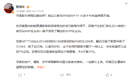 管清友微博表示“其实以美元计价的NIFTY 50近十年收益表现不错。”