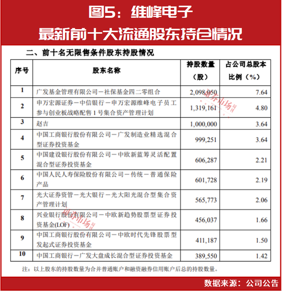 11月2日,公司发布关于回购事项大股东的最新持仓情况,以10月27日登记在册数据显示,赵吉依然位列公司前十大流通股东名单,持股较三季度末未出现变化。与此同时,维峰电子也同样被各大机构产品重点青睐,除了个人投资者赵吉,公司前十大流通股东其余九个席位均被机构投资者占领,包括社保基金四零二组合、中欧新蓝筹灵活配置基金、广发大盘成长混合基金等(见图5)。