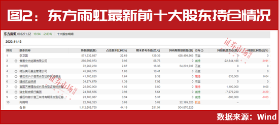 且观察发现,蓝晓科技并非朱少醒被提前曝光的四季度首只重仓股,在东方雨虹发布的截至11月13日登记在册的大股东情况显示,富国天惠精选成长基金以2560万股持仓位居公司第七大股东,最新持仓较三季度末增加了110万股,同时,由赵枫管理的睿远均衡价值三年持有基金同样仍稳坐公司前十大股东阵营,但与朱少醒不同,相较三季度末的持仓,赵枫四季度期间对东方雨虹进行了80万股的减持(见图2)。