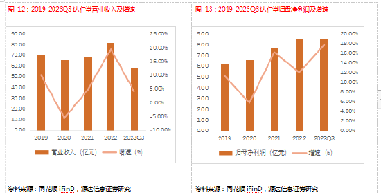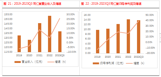2023Q1-Q3,公司实现137.21亿元,同比增长25.88%;归母净利润13.91亿元,同比增长38.67%。2023Q3,公司实现营业收入39.61亿元,同比增长16.72%;实现归母净利润4.04亿元,同比增长55.81%。2023Q1-Q3毛利率为46.28%,同比下降2.11个百分点,但由于期间费用率同比减少,公司净利率为15.84%,同比增加2.45个百分点。公司主要控股、参股子公司同仁堂科技、同仁堂国药、同仁堂商业2023上半年的业绩表现均实现正增长。
