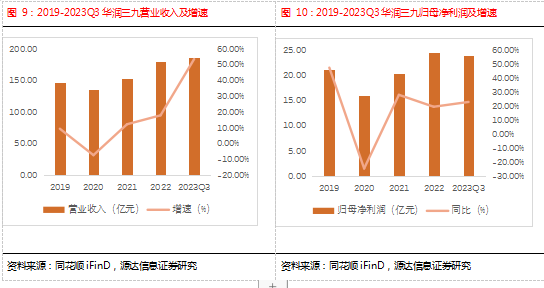 2023Q1-Q3,公司实现营业收入186.08亿元,同比增长53.65%;实现归母净利润24.03亿元,同比增长23.06%。CHC健康消费品业务实现较快增长,其中,品牌OTC、专业品牌、大健康等业务增速较快。7-8 月份感冒药整体表现比较好,主要由于年初到现在多发流感病毒,所以渠道和终端库存较低。同时,999感冒药带动抗病毒口服液、强力枇杷露等其他细分品类增长。公司处方药业务持续丰富管线,整体保持了平稳态势。国药业务在饮片业务增长带动下,前三季度基本保持稳定,但三季度由于主动调整渠道管理,配方颗粒表现不佳,对当季表现有一定影响,对全年业务表现影响相对较小。