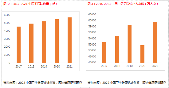 我国中医类医院从2017年的4566所增长到2021年的5715所。中医医院诊疗人次数由2017年的5.28 亿人次,增长至2019年的5.86亿人次,2020年爆发新冠疫情,诊疗人次下降,2021年恢复至5.97亿人次。