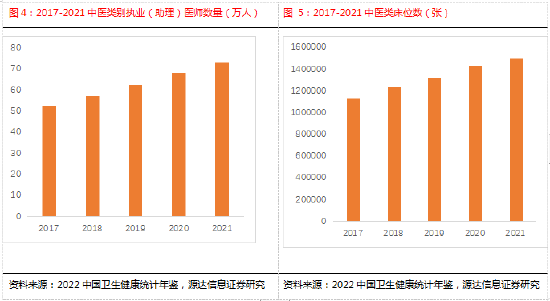 中医类别执业(助理)医师人数由2017年的52.7万人增加到2021年的73.2万人。同时,中医类床位数从2017年的113.56万张,增长到2021年的150.53万张。