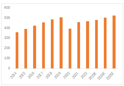 图1:2014-2023中国中药市场规模及预测(十亿元人民币)
