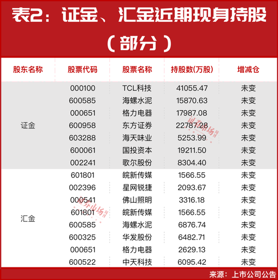 进一步拉长周期来看,在海天味业、格力电器、歌尔股份、东方证券等公司近期因股份回购等事项发布的临时股东持仓中,也同样有证金或汇金的身影,且同样均以无变动式持仓为主(见表2)。
