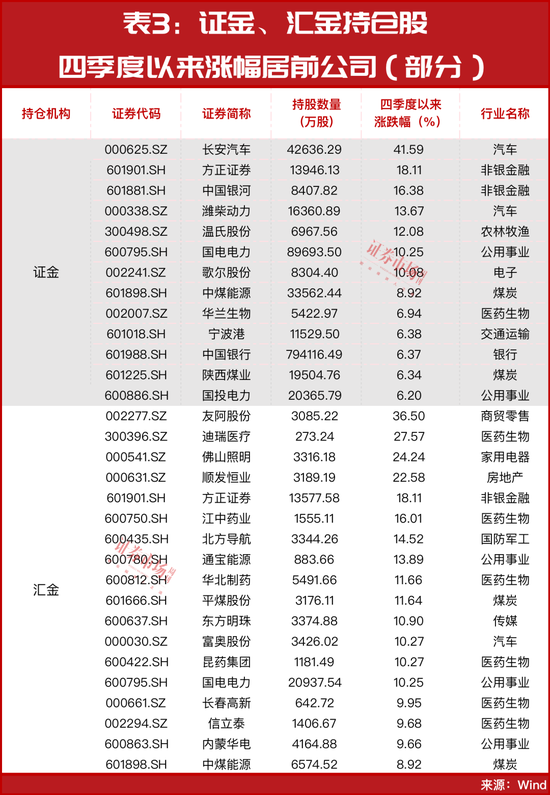 据进一步观察,证金、汇金的多只持仓股在四季度迎来不俗上涨。如截至目前来看,证金持有的长安汽车、方正证券、中国银河、潍柴动力、温氏股份、国电电力、歌尔股份、中煤能源、华兰生物等涨幅居前;汇金持有的友阿股份、迪瑞医疗、江中药业、华北制药(维权)等涨幅居前(见表3)。