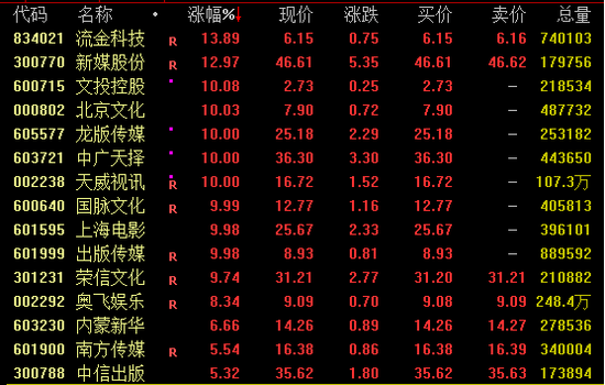 传媒板块今日再度走强,截至收盘,新媒股份涨约13%,文投控股、北京文化、龙版传媒、中广天择、天威视讯、上海电影等涨停。