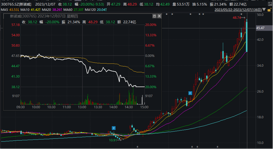昨日刚创出历史新高的新诺威午后大幅跳水,尾盘跌停,收盘报38.12元,全日成交近23亿元。