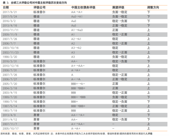 三大评级公司对中国主权评级调整事件中,评级符号直接下调只发生过三次。1999年7月20日标准普尔下调中国主权评级由BBB+至BBB,展望由负面调整为稳定,2013年4月9日,惠誉下调中国主权评级由AA-至A+,展望维持稳定,2017年5月24日穆迪投下调中国主权评级由Aa3至A1,展望由负面调整为稳定。