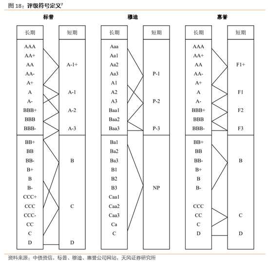 评级分为长期、短期、主体和债项评级。在等级划分方面,标普采用四等十一级制,且对于‘AA’至‘CCC’级别,可通过增加‘+’或‘-’符号来表示评级在各主要评级分类中的相对强弱;穆迪采用三等九级制,对于‘Aa’至‘Caa’级别,通过增加修正数字1、2、3来表示同类评级中的相对排位,其中数字1表示级别在所属同类评级中排位较高,数字3则表示级别在所属同类评级中排位较低;惠誉也采用四等十一级制,但与标普和穆迪不同的是,修正符号‘+’和‘-’可用于‘AA’至‘B’级别。