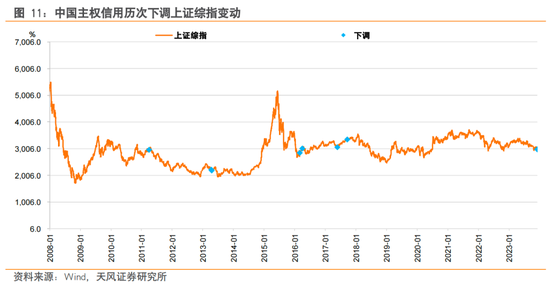 从实际影响来看,我们观察2011年以来历次下调主权评级及信用展望对我国资本市场的影响。