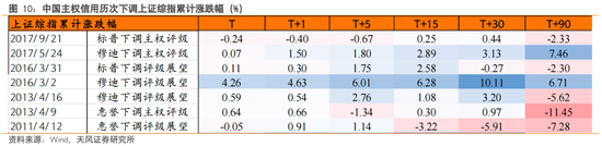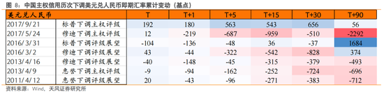 具体来看,根据2011年以来的情况,下调评级或展望后t+30维度10年国债利率以下行为主、t+90维度10年国债利率以上行为主。