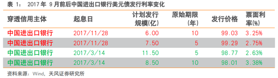 我们挑选相同发行主体中国进出口银行在2017年5月24日和2017年9月21日评级调整前后发行同期限美元债的利率,可以发现在穆迪和标普分别下调中国主权信用评级后,中国进出口银行境外融资成本并没有明显的变化趋势。
