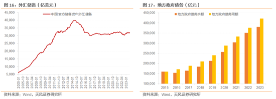 中国官方储备的外汇资产也由2014年中旬的4万亿美元逐步下降至2017年4月的3.03万亿美元,随后趋于稳定。而包含地方政府债券形式和非地方政府债券形式的地方政府债务余额最近几年也呈逐渐上升的趋势。