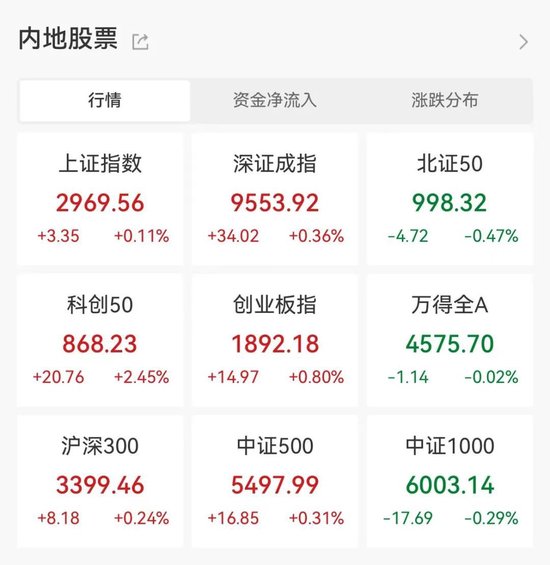 12月8日,A股三大指数集体走强。沪指震荡反弹,收涨0.11%,报2969.56点。创业板指走势亮眼,午后一度涨逾1%。截至收盘,深证成指涨0.36%,创业板指涨0.8%。
