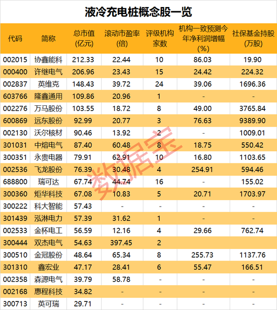 据证券时报·数据宝不完全统计,A股市场中,布局液冷充电桩相关业务的概念股不足30只。从机构关注度来看,英维克、瑞可达、许继电气、协鑫能科、永贵电器排名前五,评级机构依次有24家、16家、15家、10家、10家。