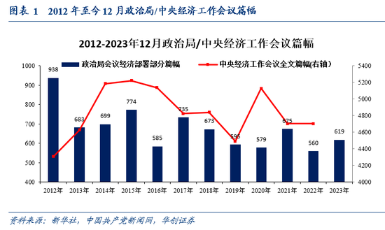 年底12月政治局会议一般是两个事项套开,一方面分析研究次年经济工作,一方面听取中央纪委、国家监委的工作汇报,研究部署次年党风廉政建设和反腐败工作。通稿上也包括两方面内容,作为金融市场我们更关注经济部署相关篇幅(主体结构基本稳定在三段,第一段总结今年→第二段定调明年→第三段部署明年,其中最重要的其实只有两段,就是定调和部署)。我们将过去十年历次12月政治局会议经济定调部署的篇幅字数作比较,可得本次会议经济相关篇幅与去年类似(今年619字左右,去年560字),篇幅依然属于非常短小的。