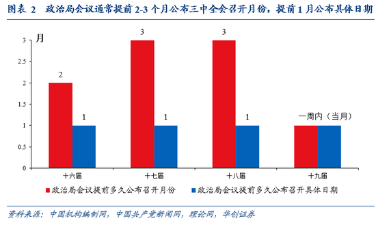 十六届至十八届政治局会议均提前2-3个月公布三中全会召开月份,提前1个月内公布具体召开日期。如2018年8月27日政治局会议决定当年11月召开十八届三中全会,2018年10月29日政治局会议决定具体召开日期为11月9日至12日。