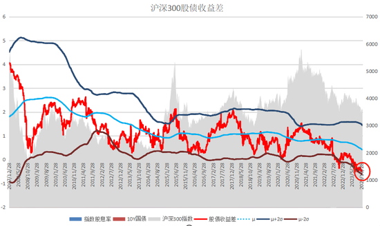 注:股债收益差(红线)越低,越接近-2X标准差,说明股票性价比越高,股票越低估。股债收益差(红线)越高,说明股票性价比越低,股票越高估。