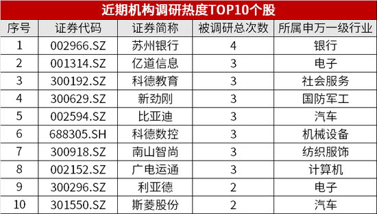 近一周从机构调研数据来看,机械设备、电子、计算机、电力设备、汽车等板块调研热度居前。近一周调研次数居前的个股包括:苏州银行、亿道信息、科德教育、新劲刚等。