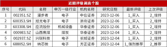 近期机构评级调高的个股包括漫步者、旭光电子、应流股份、山西焦煤、兴瑞科技、纳芯微。