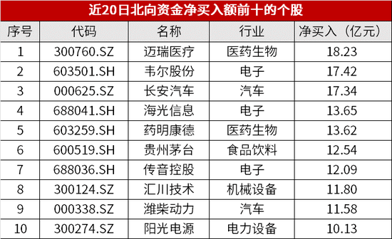 从个股来看,代表北向资金短期资金偏好的近5个交易日北向资金净买入居前的标的为贵州茅台(+14.24亿)、中际旭创(+8.69亿)、药明康德(维权)(+8.38亿)等;代表北向资金较为长期资金偏好的近20日净买入居前的包括迈瑞医疗(+18.23亿元)、韦尔股份(+17.42亿元)、长安汽车(+17.34亿元)等。