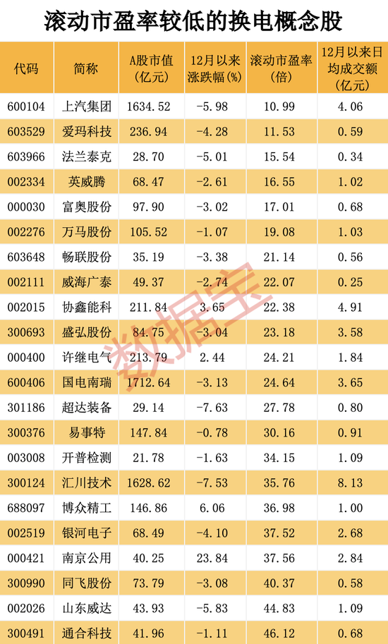 证券时报·数据宝粗略统计,A股市场中,共60股布局换电产业。截至12月11日收盘,这些概念股中,滚动市盈率低于40倍的有19只,上汽集团、爱玛科技、法兰泰克、英威腾、富奥股份、万马股份等均低于20倍。