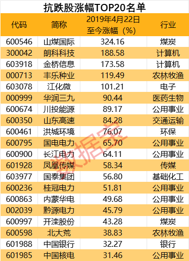 从市场表现来看,上述45只抗跌股自2019年4月22日至2023年12月12日期间平均涨幅超过40%。按照涨幅排序,前14家公司累计涨幅均超过50%,累计涨幅居首的是山煤国际,涨幅超过320%;其次的朗科科技、金桥信息等4股,累计涨幅均超过100%。