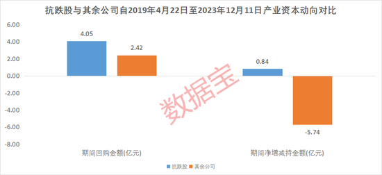 此外,从产业资本的动向来看,自2019年4月22日~2023年12月11日期间,上述45家抗跌公司平均回购4.05亿元,重要股东平均净增持0.84亿元;其余公司在此期间平均回购2.42亿元,平均净减持5.74亿元。可见,上市公司的回购、增持对于稳定上市公司的股价也会产生正向的影响。