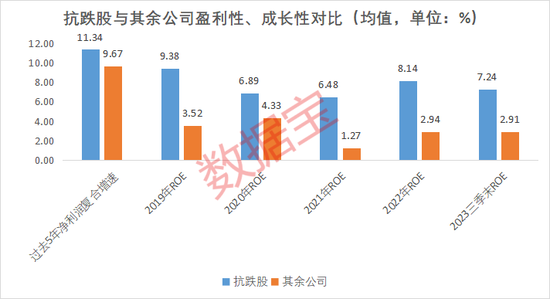 数据显示,抗跌股在盈利性及成长性方面依然完胜其余公司。成长性方面,抗跌股过去5年净利润复合增长率平均达到11.34%,其余公司平均低于10%。复合增长率超过10%的公司中,抗跌股占比近四成,其余公司仅三成左右。复合增长率为负数的公司中,抗跌股占比仅有24%左右,其余公司占比超过半数。