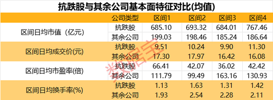 另外,抗跌股的日均市值明显超过其余公司。区间1—区间4的抗跌股日均市值平均值均超过650亿元,其余公司在每个区间的平均值均低于200亿元。可见,大市值公司更能抵御市场波动。