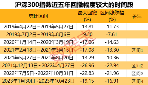 证券时报·数据宝以近五年来,沪深300指数区间内最大回撤超过9%的八个时间段为统计区间(具体见下表格),其中沪深300指数在2021年2月18日~2021年3月15日(为方便计算,命名为区间1),2021年12月13日~2022年4月27日(区间2),2022年7月5日~2022年10月31日(区间3),2023年1月30日~2023年10月23日(区间4)4个区间的回撤较大,在区间2的回撤幅度接近27%。