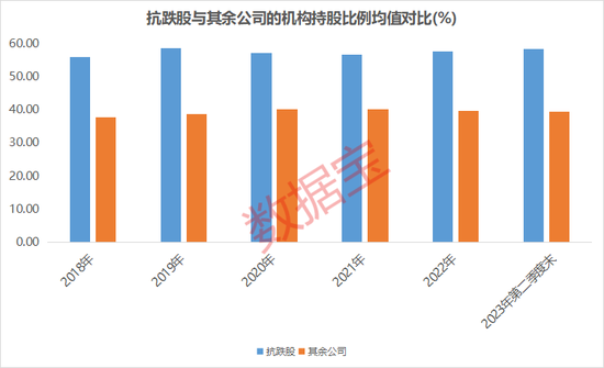 从机构持股来看(含一般法人),分别对比抗跌股及其余公司2018年~2022年年末,以及2023年第二季度末的机构持股比例。统计显示,抗跌股的机构持股比例均值持续超过其余公司,2022年年末,抗跌股机构持股比例均值为57.75%,其余公司为39.65%;2023年第二季度末,抗跌股的机构持股比例均值为58.51%,其余公司均值依然低于40%。