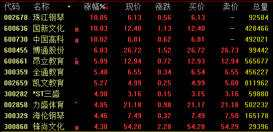 教育板块盘中发力走高,截至收盘,珠江钢琴、国新文化、中国高科涨停,博通股份、昂立教育、全通教育、凯文教育等涨超5%。