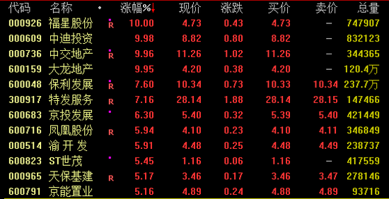 地产板块今日强势拉升,截至收盘,福星股份、中迪投资、中交地产、大龙地产等涨停,保利发展、特发服务涨超7%,招商蛇口涨超4%,万科A涨逾3%。
