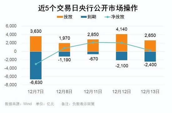数据显示,本周央行公开市场将有10770亿元逆回购到期,其中周三至周五分别到期2400亿元、3630亿元、1970亿元。此外,周五(12月15日)还有6500亿元MLF到期。