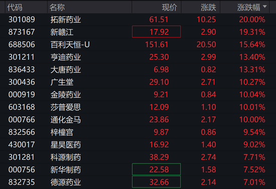 拓新药业20CM涨停,新赣江、上海凯宝、新华制药、振东制药、亨迪药业等跟涨。