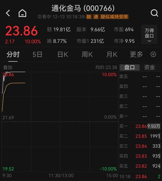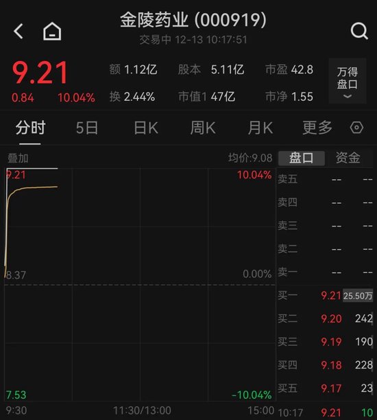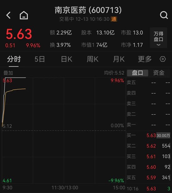 12月13日早盘,多只医药概念股涨停,金陵药业、通化金马直线涨停。
