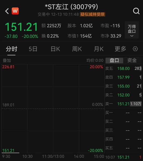 12月13日,“最贵ST股”*ST左江(维权)开盘20cm跌停。