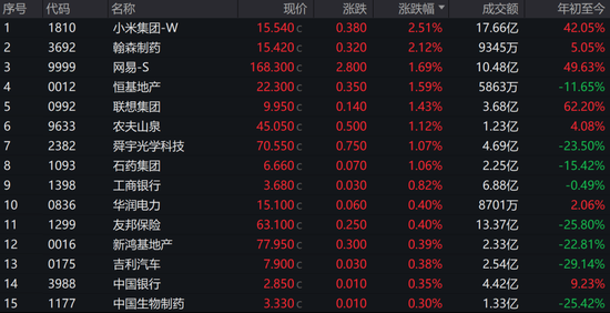 小米集团涨2.51%,翰森制药涨2.12%,网易涨1.69%,领涨蓝筹。